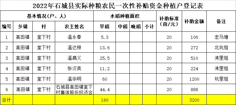 【涉農(nóng)補(bǔ)貼】2022年高田鎮(zhèn)堂下村實(shí)際種糧農(nóng)民一次性補(bǔ)貼資金種植戶登記表