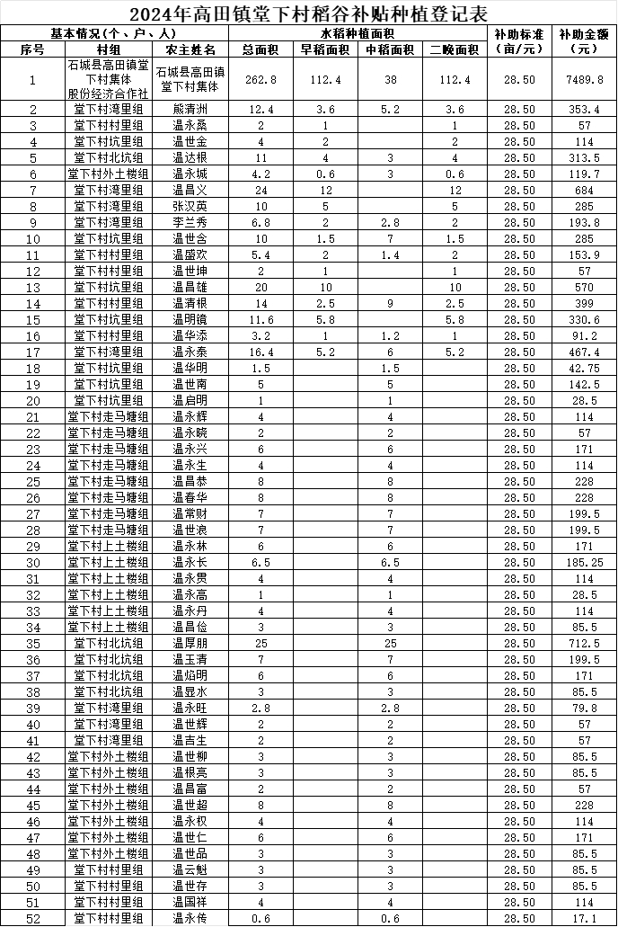【涉農(nóng)補貼】2024年高田鎮(zhèn)堂下村稻谷補貼種植登記表
