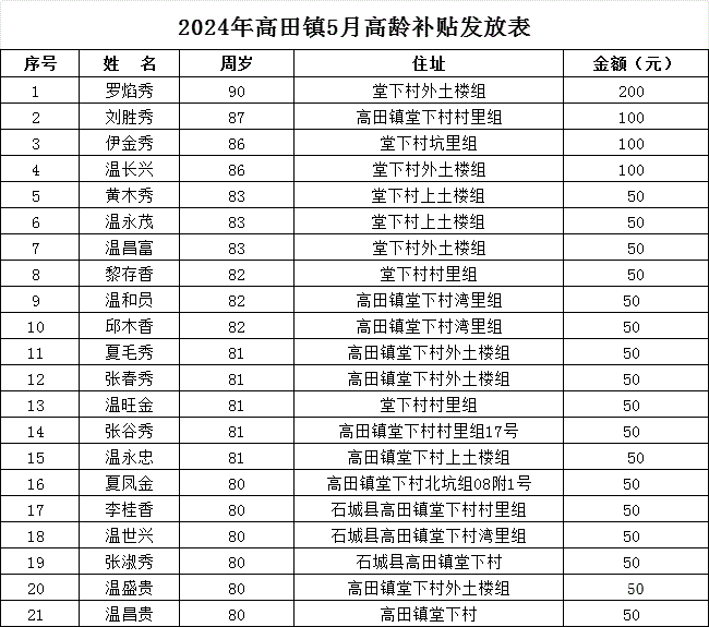 【老年人申領(lǐng)補(bǔ)貼和發(fā)放信息】2024年高田鎮(zhèn)堂下村5月高齡補(bǔ)貼發(fā)放表
