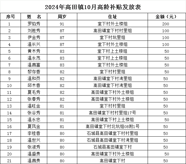 【老年人申領(lǐng)補(bǔ)貼和發(fā)放信息】2024年高田鎮(zhèn)堂下村10月高齡補(bǔ)貼發(fā)放表