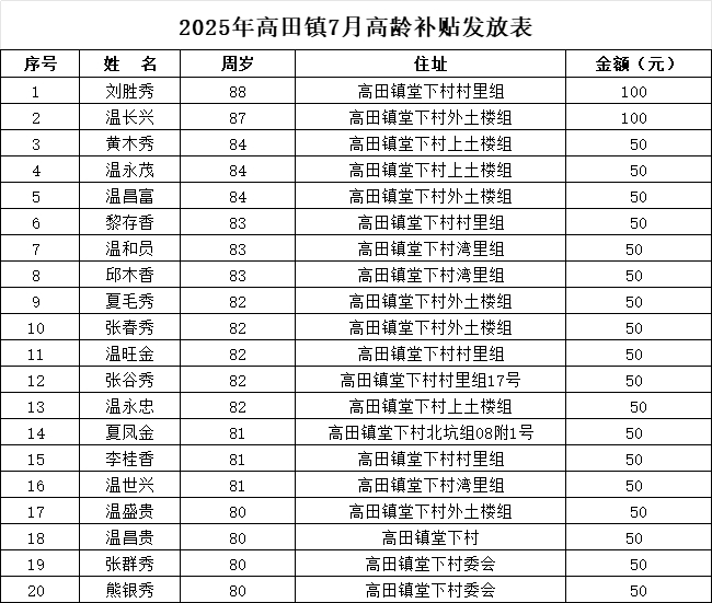 【老年人申領補貼和發(fā)放信息】2025年高田鎮(zhèn)堂下村7月高齡補貼發(fā)放表