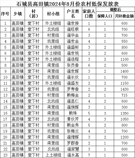 【最低生活保障】石城縣高田鎮(zhèn)堂下村2024年8月份農(nóng)村低保發(fā)放公示