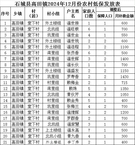 【最低生活保障】石城縣高田鎮(zhèn)堂下村2024年12月份農(nóng)村低保發(fā)放公示