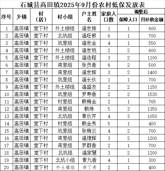 【最低生活保障】石城縣高田鎮(zhèn)堂下村2025年9月份農(nóng)村低保發(fā)放公示