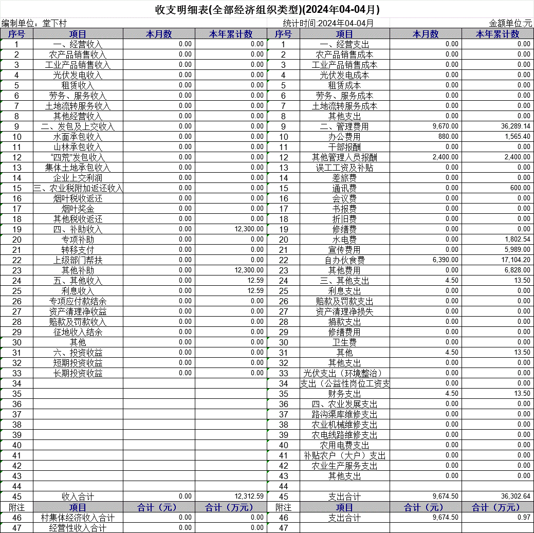 【村(社區(qū))財(cái)務(wù)收支狀況】高田鎮(zhèn)堂下村2024年4月份財(cái)務(wù)收支狀況明細(xì)賬