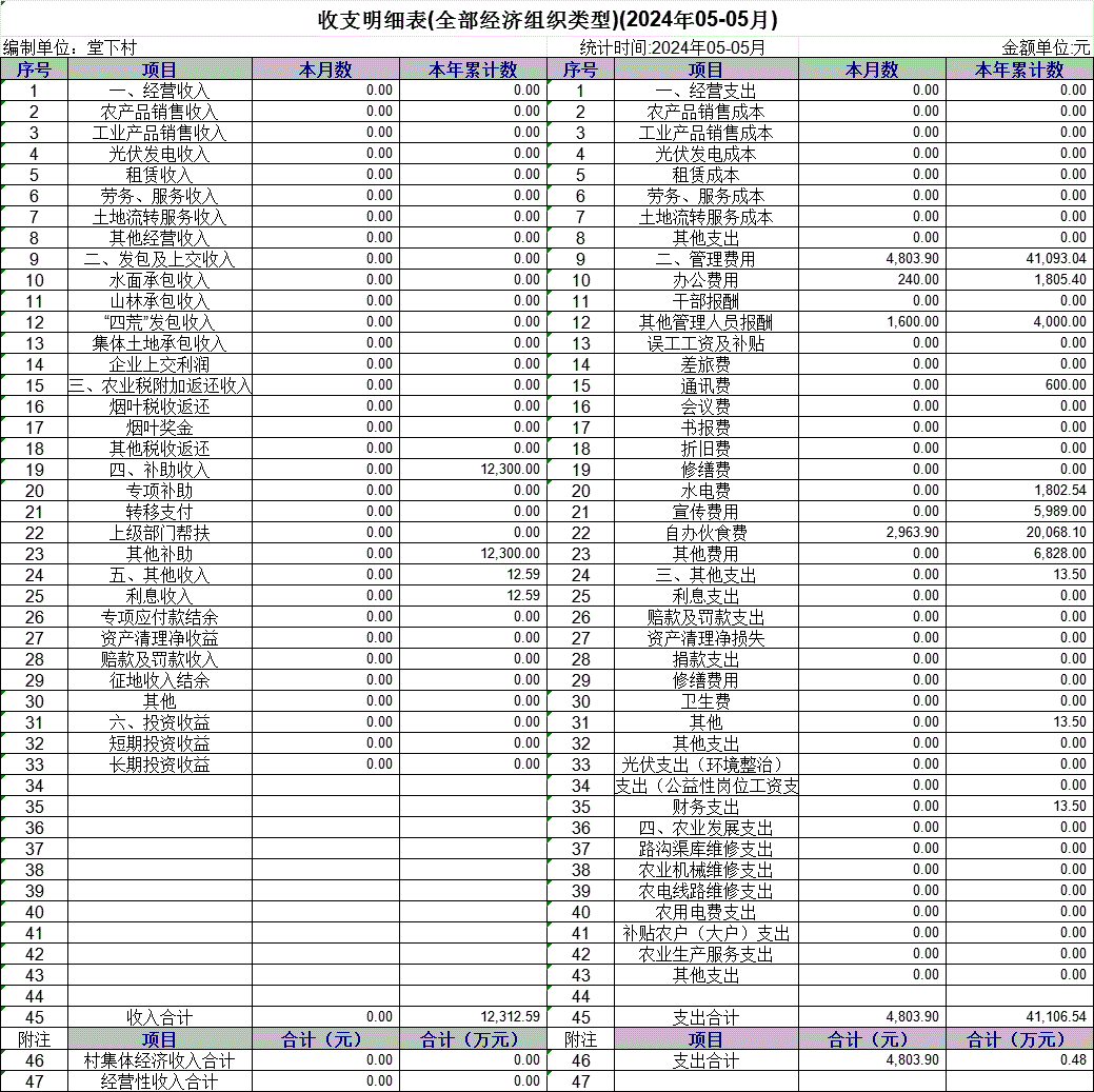 【村(社區(qū))財務收支狀況】高田鎮(zhèn)堂下村2024年5月份財務收支狀況明細賬