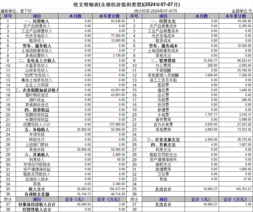 【村(社區(qū))財(cái)務(wù)收支狀況】高田鎮(zhèn)堂下村2024年7月份財(cái)務(wù)收支狀況明細(xì)賬