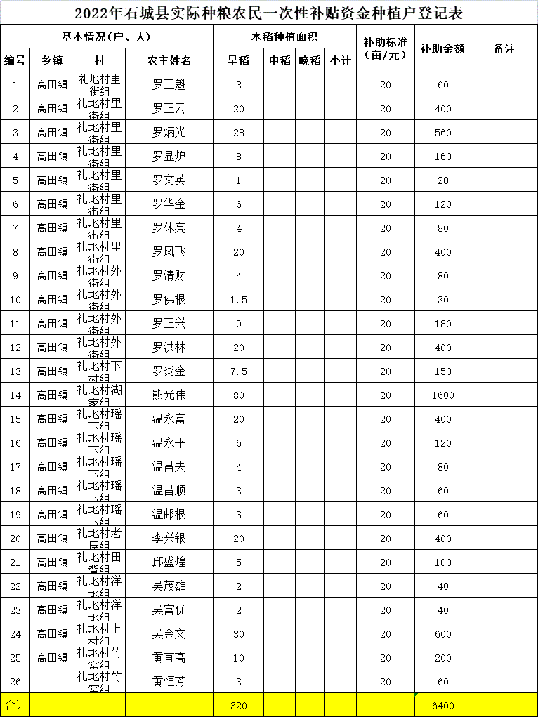【涉農(nóng)補貼】2022年高田鎮(zhèn)禮地村實際種糧農(nóng)民一次性補貼資金種植戶登記表