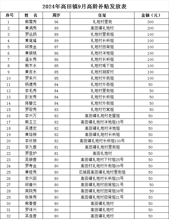 【老年人申領補貼和發(fā)放信息】2024年高田鎮(zhèn)禮地村9月高齡補貼發(fā)放表