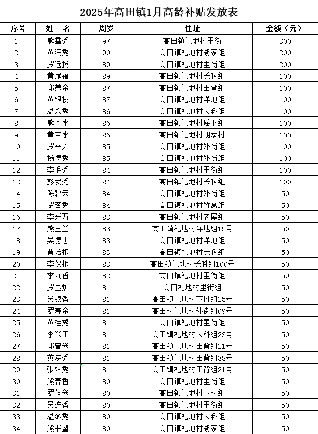 【老年人申領(lǐng)補(bǔ)貼和發(fā)放信息】2025年高田鎮(zhèn)禮地村1月高齡補(bǔ)貼發(fā)放表
