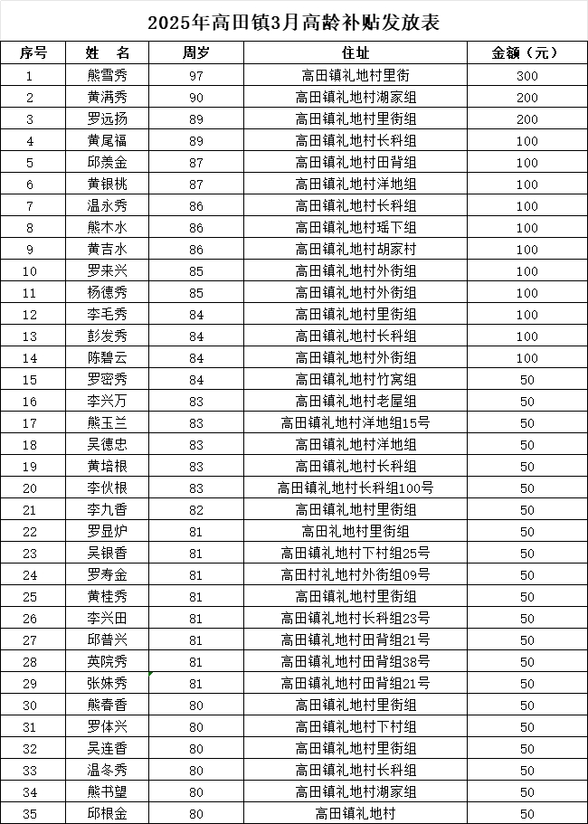【老年人申領(lǐng)補貼和發(fā)放信息】2025年高田鎮(zhèn)禮地村3月高齡補貼發(fā)放表