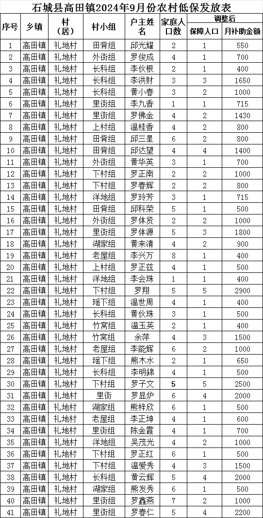 【最低生活保障】石城縣高田鎮(zhèn)禮地村2024年9月份農(nóng)村低保發(fā)放公示
