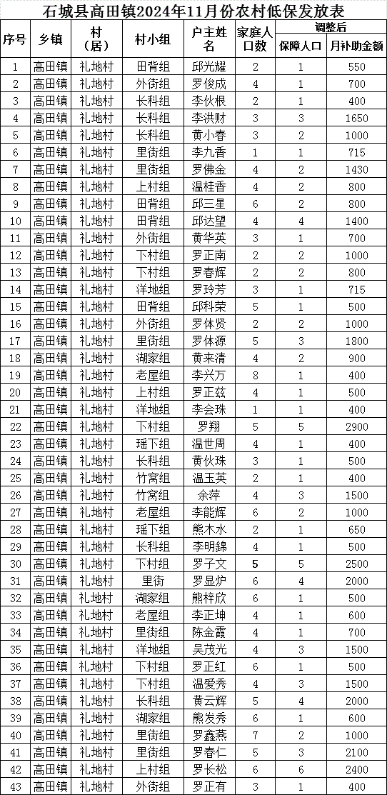 【最低生活保障】石城縣高田鎮(zhèn)禮地村2024年11月份農(nóng)村低保發(fā)放公示