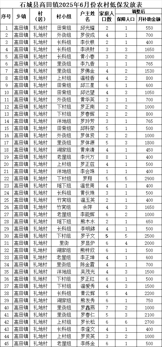 【最低生活保障】石城縣高田鎮(zhèn)禮地村2025年6月份農(nóng)村低保發(fā)放公示