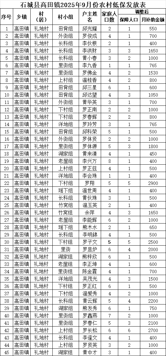 【最低生活保障】石城縣高田鎮(zhèn)禮地村2025年9月份農(nóng)村低保發(fā)放公示