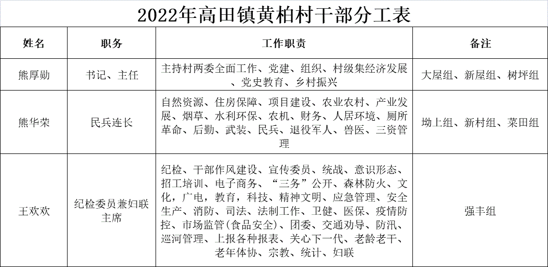 【村(居)委會(huì)成員信息】2022年高田鎮(zhèn)黃柏村干部分工表