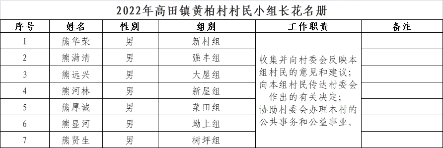 【其他人員信息】2022年高田鎮(zhèn)黃柏村村民小組長花名冊