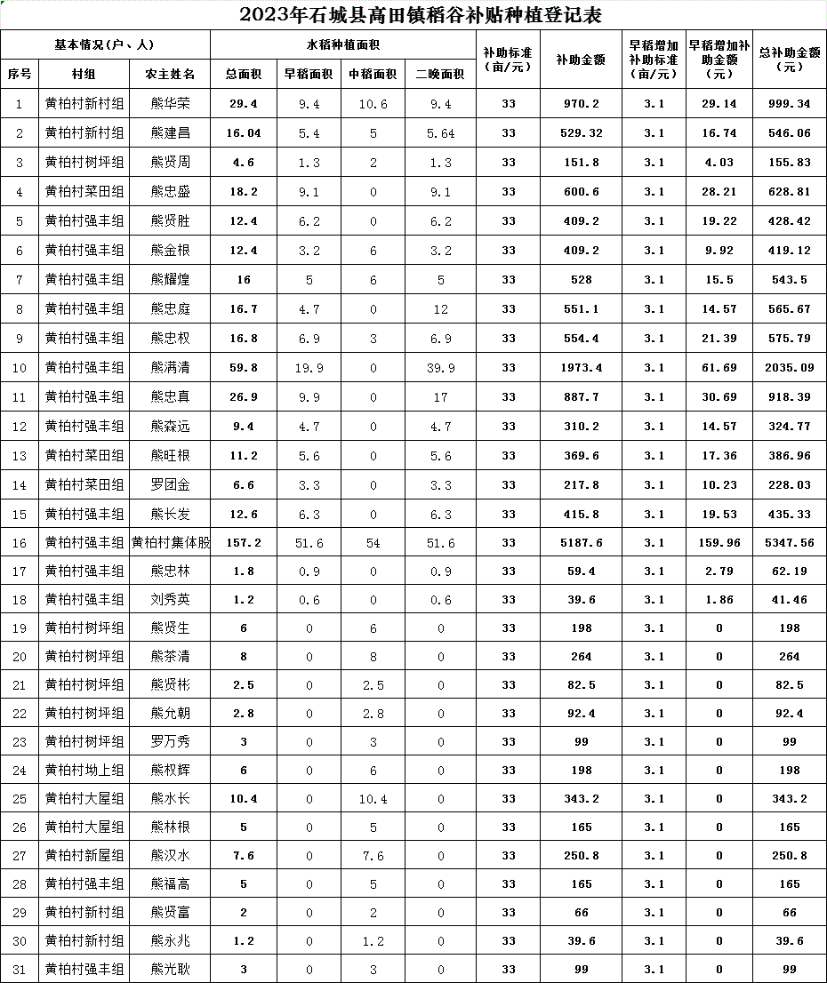 【涉農(nóng)補貼】2023年高田鎮(zhèn)黃柏村稻谷補貼種植登記表
