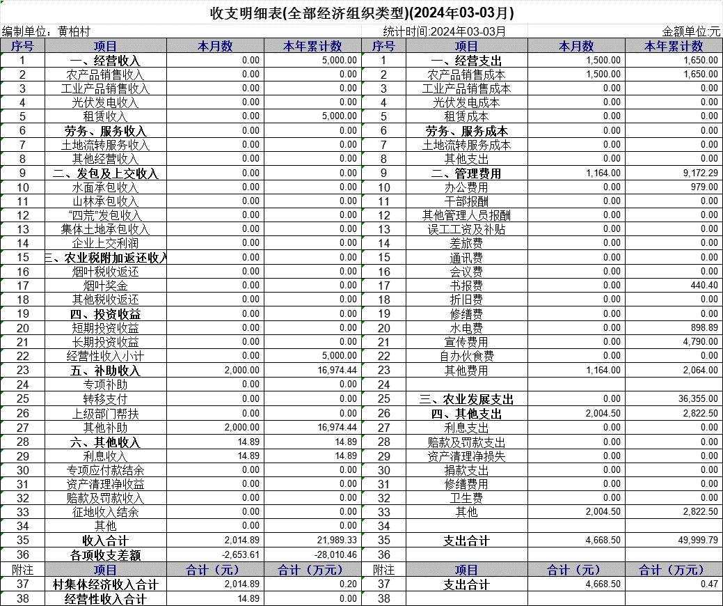 【村(社區(qū))財(cái)務(wù)收支狀況】高田鎮(zhèn)黃柏村2024年3月份財(cái)務(wù)收支狀況明細(xì)賬