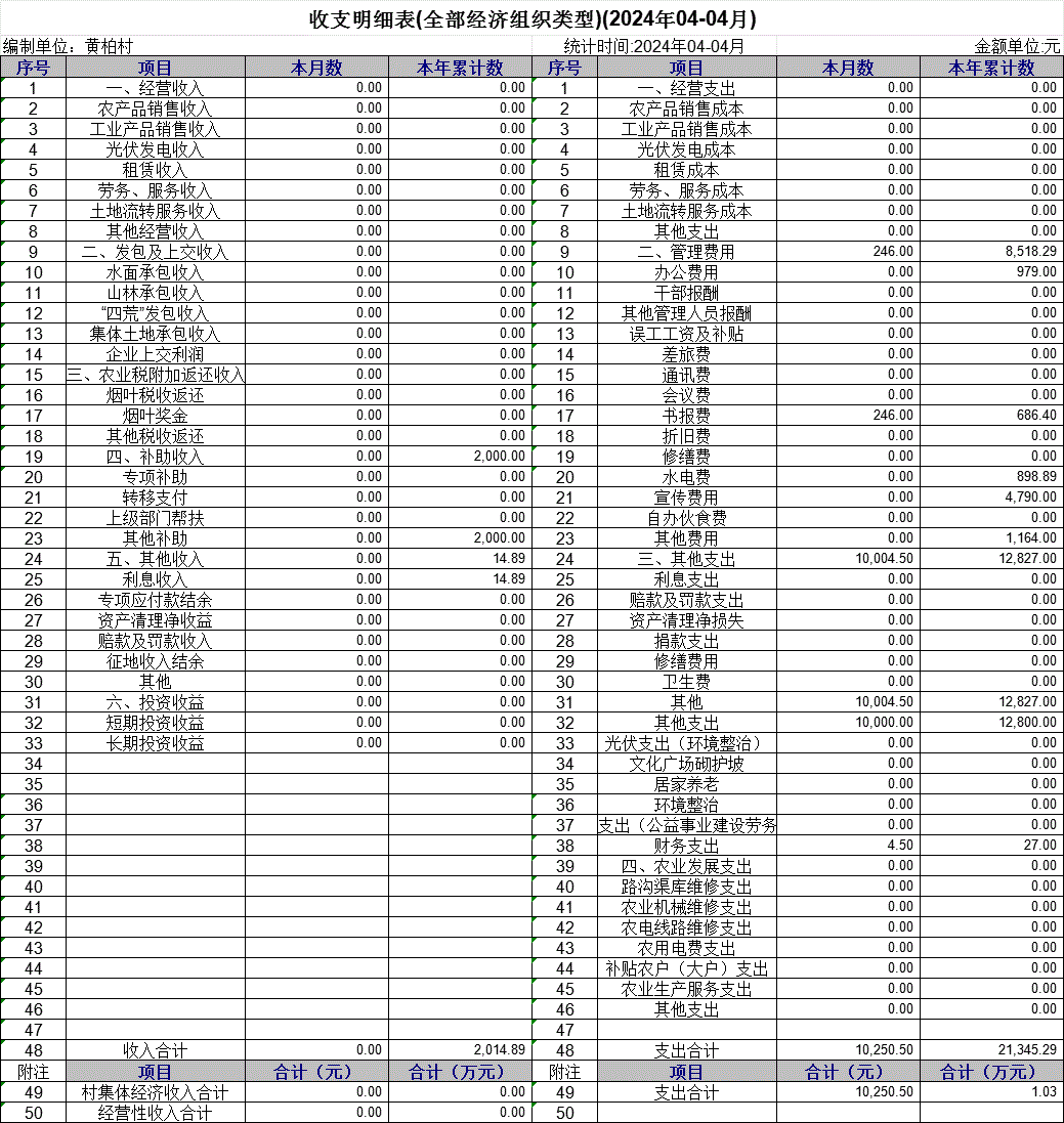 【村(社區(qū))財(cái)務(wù)收支狀況】高田鎮(zhèn)黃柏村2024年4月份財(cái)務(wù)收支狀況明細(xì)賬