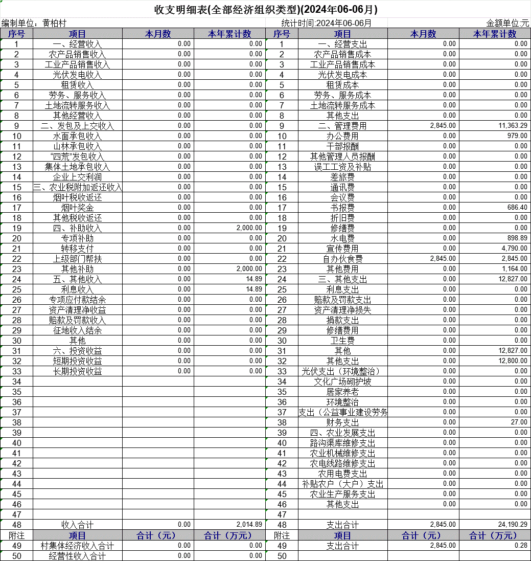 【村(社區(qū))財務(wù)收支狀況】高田鎮(zhèn)黃柏村2024年6月份財務(wù)收支狀況明細賬