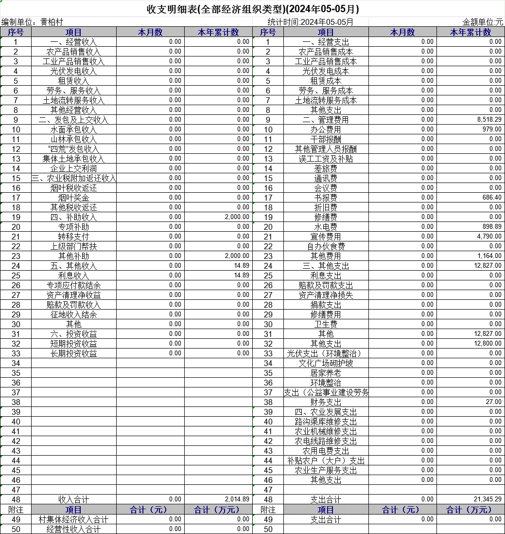 【村(社區(qū))財(cái)務(wù)收支狀況】高田鎮(zhèn)黃柏村2024年5月份財(cái)務(wù)收支狀況明細(xì)賬