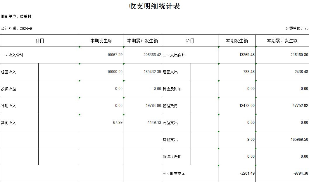 【村(社區(qū))財(cái)務(wù)收支狀況】高田鎮(zhèn)黃柏村2024年9月份財(cái)務(wù)收支狀況明細(xì)賬