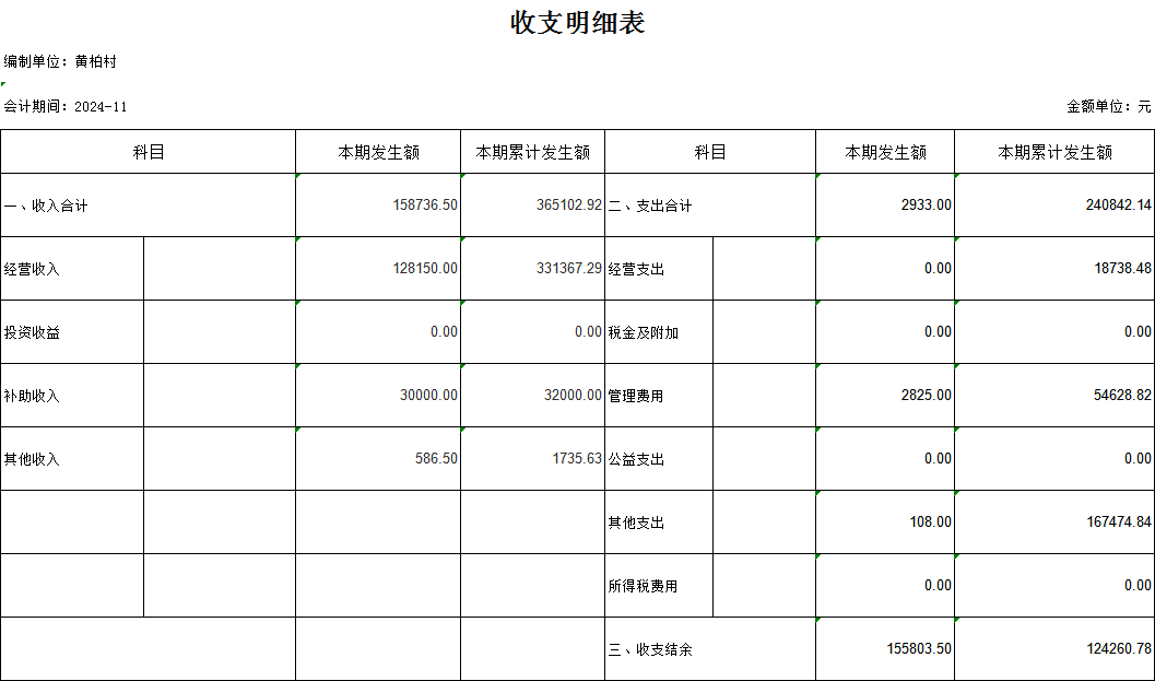 【村(社區(qū))財(cái)務(wù)收支狀況】高田鎮(zhèn)黃柏村2024年11月份財(cái)務(wù)收支狀況明細(xì)賬