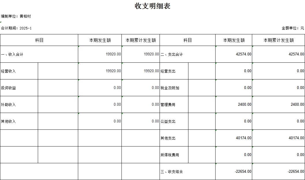 【村(社區(qū))財(cái)務(wù)收支狀況】高田鎮(zhèn)黃柏村2025年1月份財(cái)務(wù)收支狀況明細(xì)賬