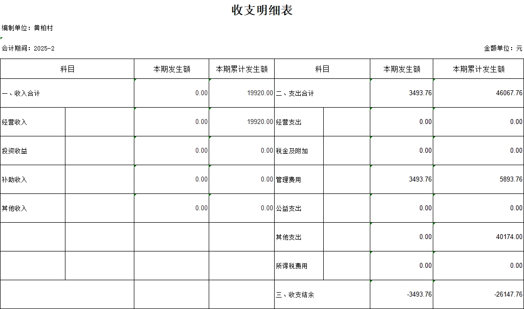 【村(社區(qū))財務(wù)收支狀況】高田鎮(zhèn)黃柏村2025年2月份財務(wù)收支狀況明細賬