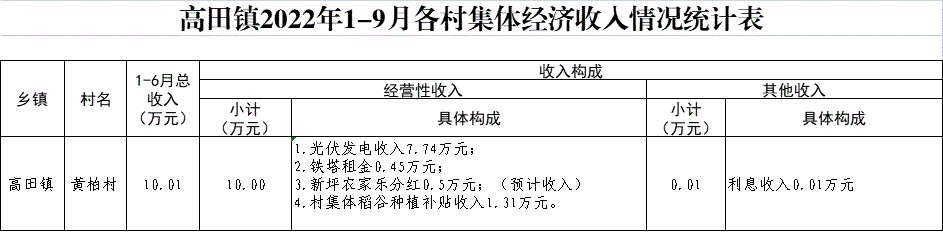 【集體統(tǒng)一經(jīng)營的經(jīng)營性資產(chǎn)】高田鎮(zhèn)黃柏村2022年1-9月各村集體經(jīng)濟收入情況統(tǒng)計表