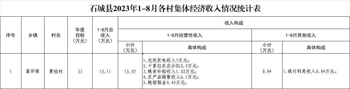 【集體統(tǒng)一經(jīng)營(yíng)的經(jīng)營(yíng)性資產(chǎn)】高田鎮(zhèn)黃柏村2023年1-8月集體經(jīng)濟(jì)收入情況統(tǒng)計(jì)表