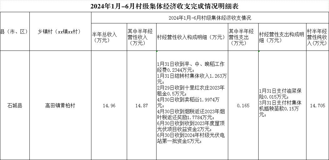 【集體統一經營的經營性資產】高田鎮(zhèn)黃柏村2024年1-6月各村集體經濟收入情況統計表