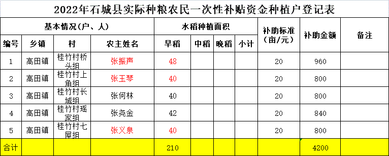 【涉農補貼】2022年高田鎮(zhèn)桂竹村實際種糧農民一次性補貼資金種植戶登記表