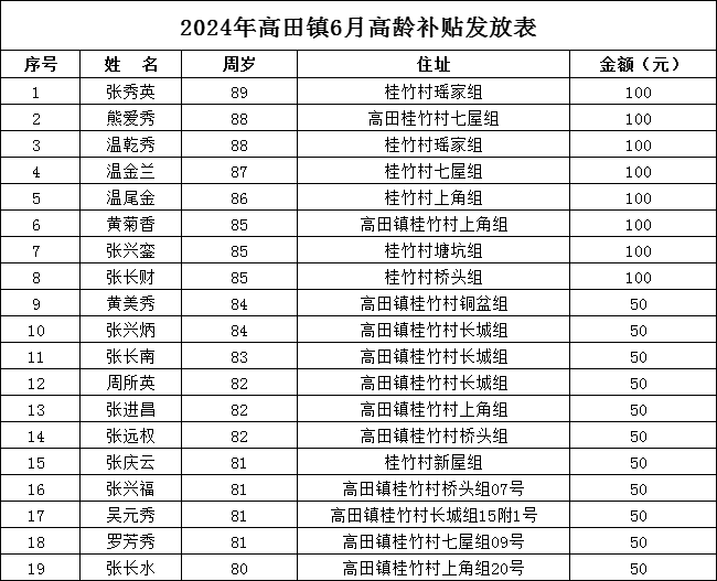【老年人申領補貼和發(fā)放信息】2024年高田鎮(zhèn)桂竹村6月高齡補貼發(fā)放表