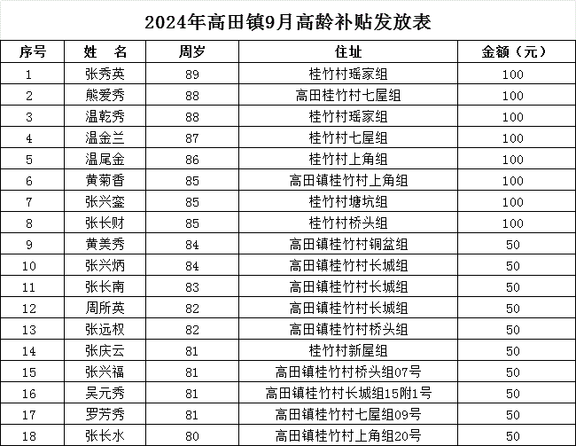 【老年人申領(lǐng)補(bǔ)貼和發(fā)放信息】2024年高田鎮(zhèn)桂竹村9月高齡補(bǔ)貼發(fā)放表