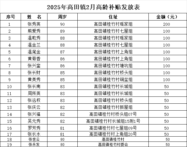 【老年人申領(lǐng)補(bǔ)貼和發(fā)放信息】2025年高田鎮(zhèn)桂竹村2月高齡補(bǔ)貼發(fā)放表