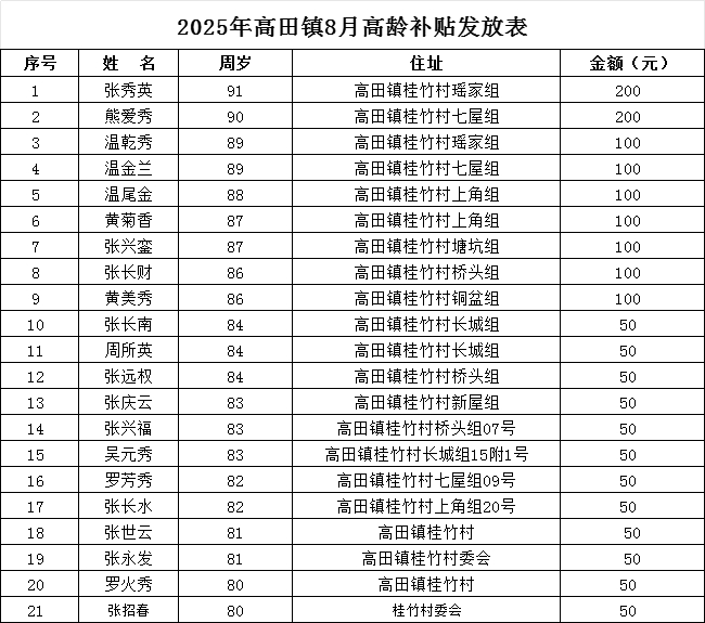 【老年人申領補貼和發(fā)放信息】2025年高田鎮(zhèn)桂竹村8月高齡補貼發(fā)放表