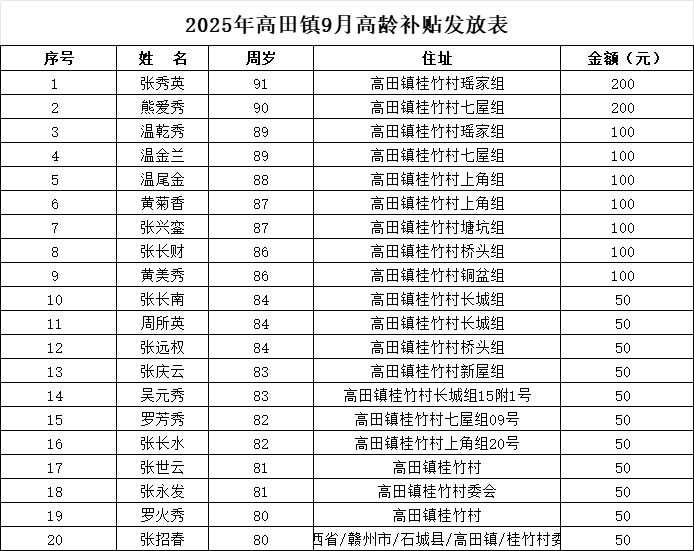 【老年人申領補貼和發(fā)放信息】2025年高田鎮(zhèn)桂竹村9月高齡補貼發(fā)放表