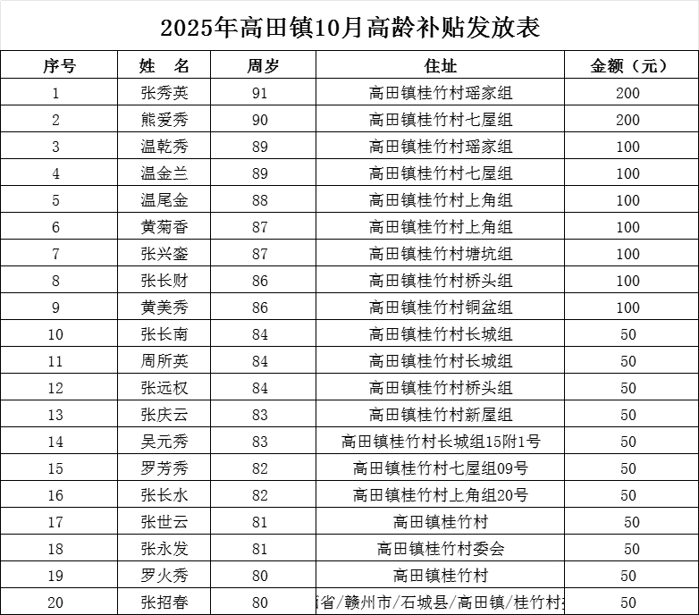 【老年人申領(lǐng)補貼和發(fā)放信息】2025年高田鎮(zhèn)桂竹村10月高齡補貼發(fā)放表