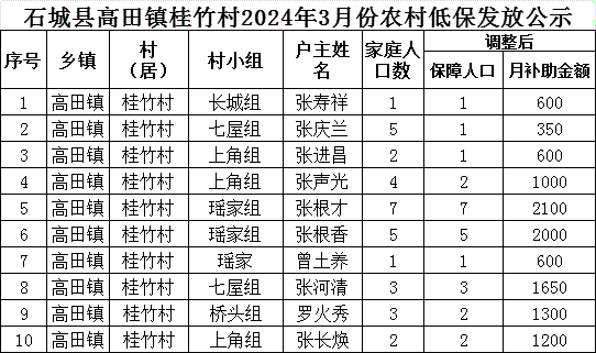 【最低生活保障】石城縣高田鎮(zhèn)桂竹村2024年3月份農(nóng)村低保發(fā)放公示