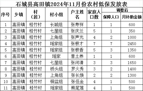 【最低生活保障】石城縣高田鎮(zhèn)桂竹村2024年11月份農(nóng)村低保發(fā)放公示