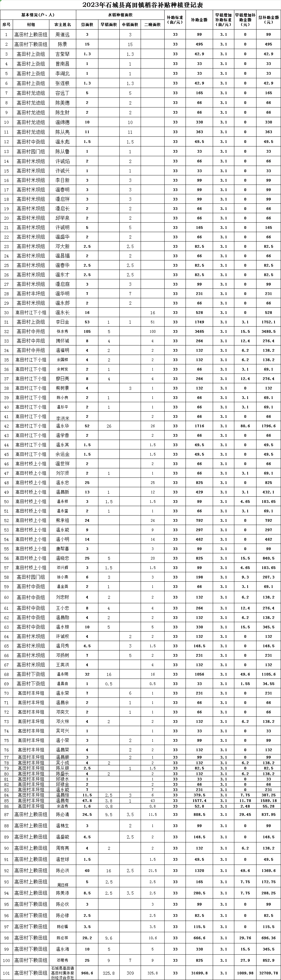【涉農(nóng)補(bǔ)貼】2023年高田鎮(zhèn)高田村稻谷補(bǔ)貼種植登記表