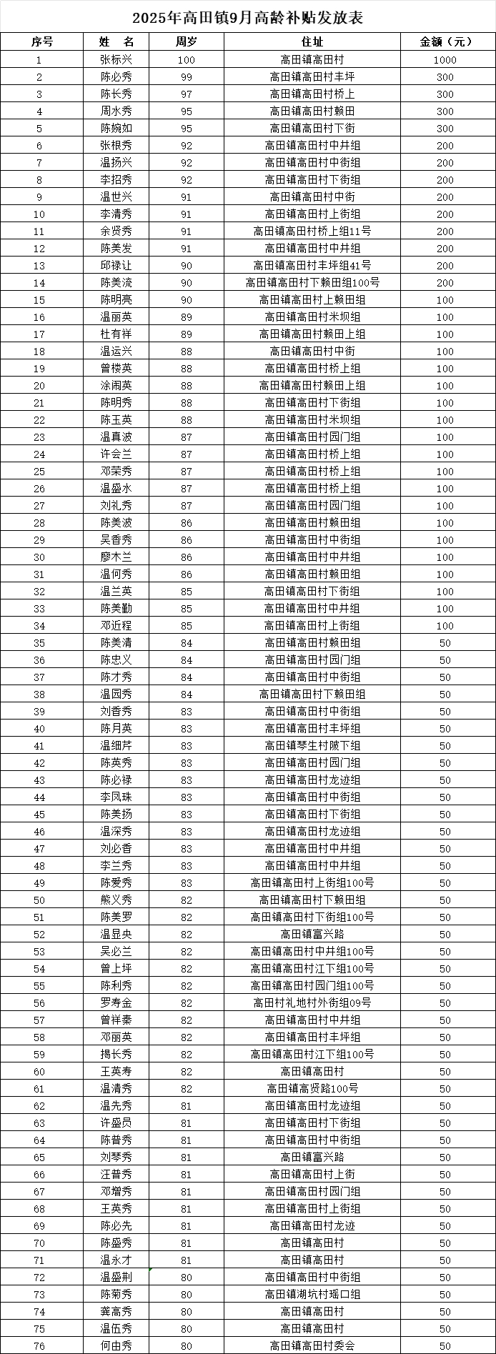 【老年人申領(lǐng)補(bǔ)貼和發(fā)放信息】2025年高田鎮(zhèn)高田村9月高齡補(bǔ)貼發(fā)放表