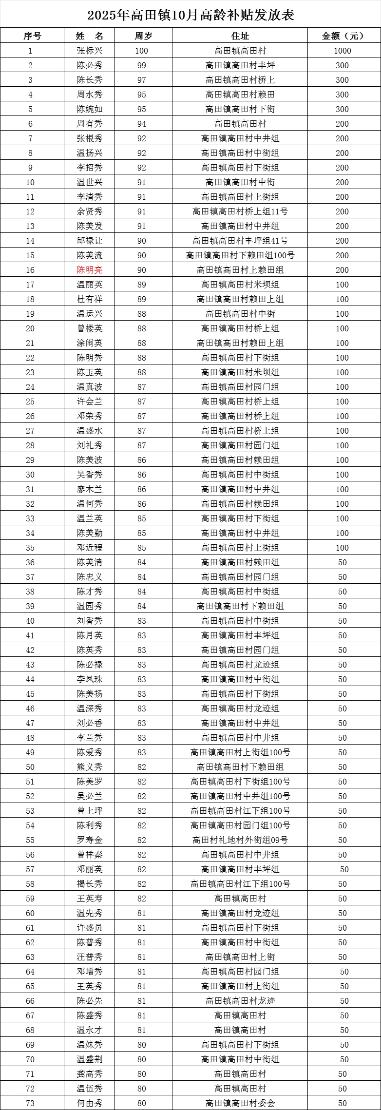 【老年人申領補貼和發(fā)放信息】2025年高田鎮(zhèn)高田村10月高齡補貼發(fā)放表
