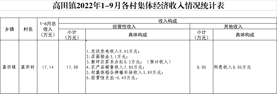 【集體統一經營的經營性資產】高田鎮(zhèn)高田村2022年1-9月各村集體經濟收入情況統計表