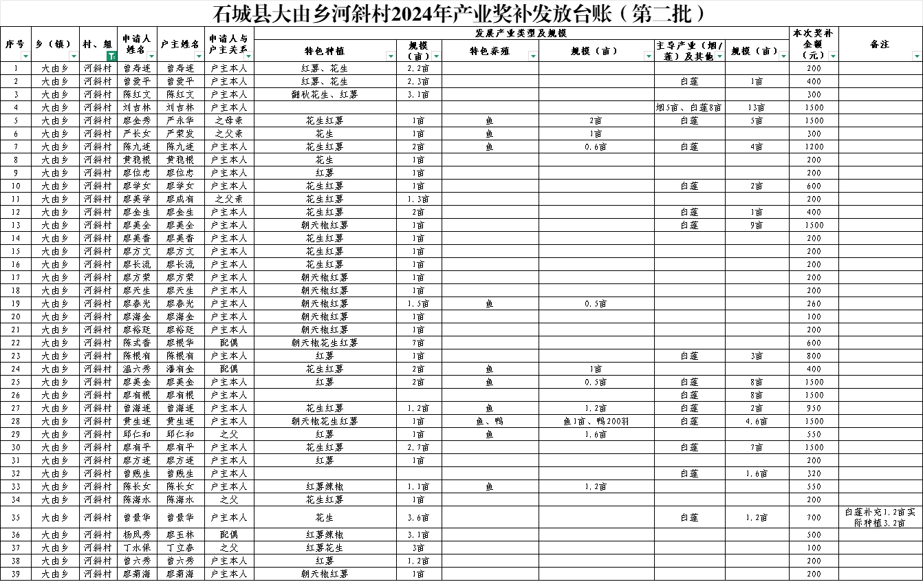 石城縣大由鄉(xiāng)河斜村2024年產(chǎn)業(yè)獎補(bǔ)發(fā)放臺賬(第二批)