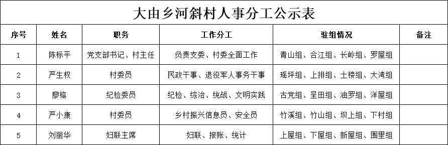 2023年大由鄉(xiāng)河斜村人事分工公示表