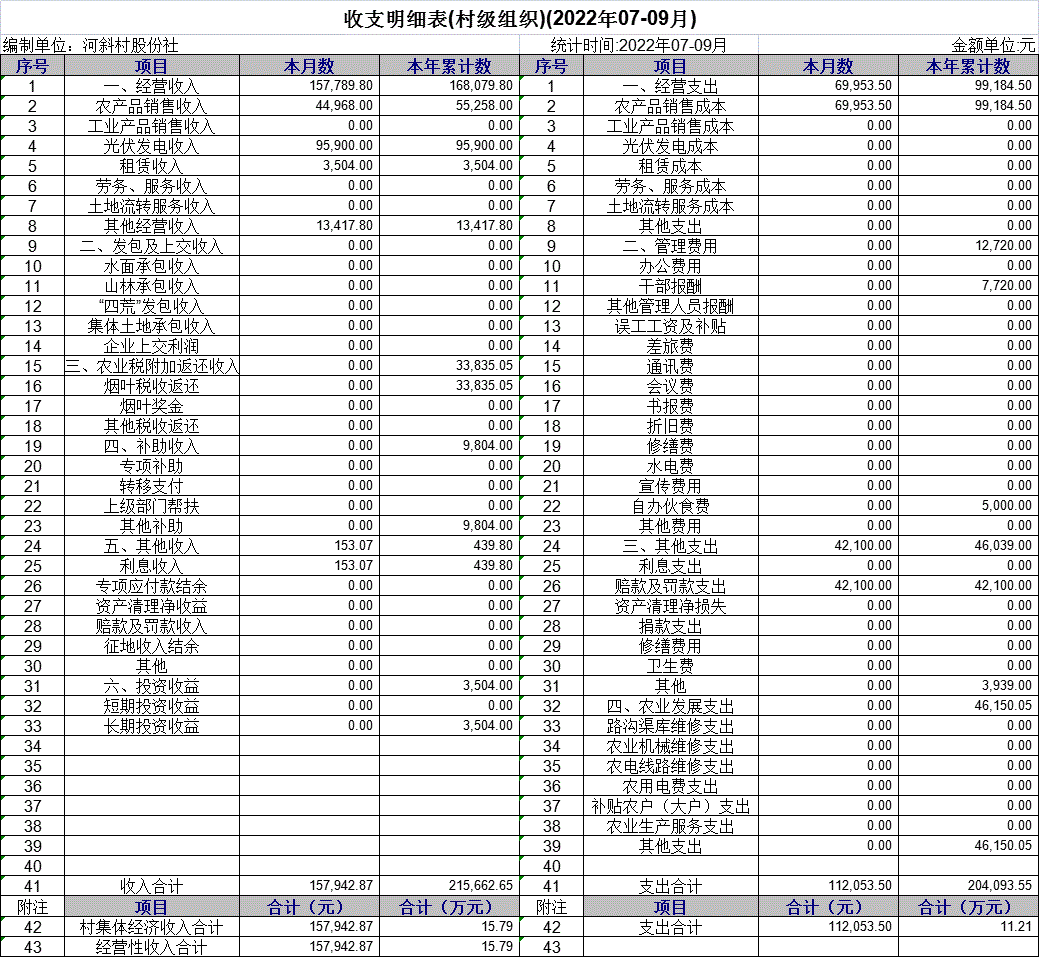 大由鄉(xiāng)河斜村2022年7-9月收支明細