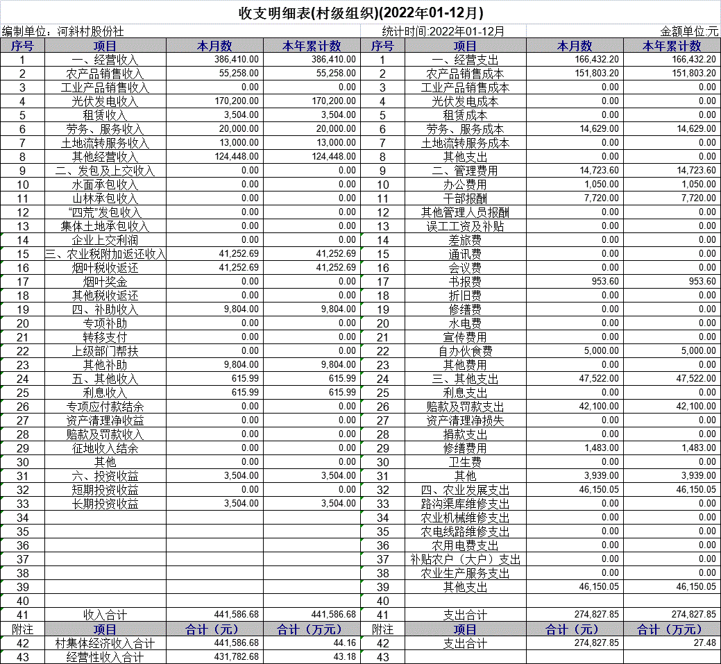 大由鄉(xiāng)河斜村2022年01-12月收支明細(xì)表
